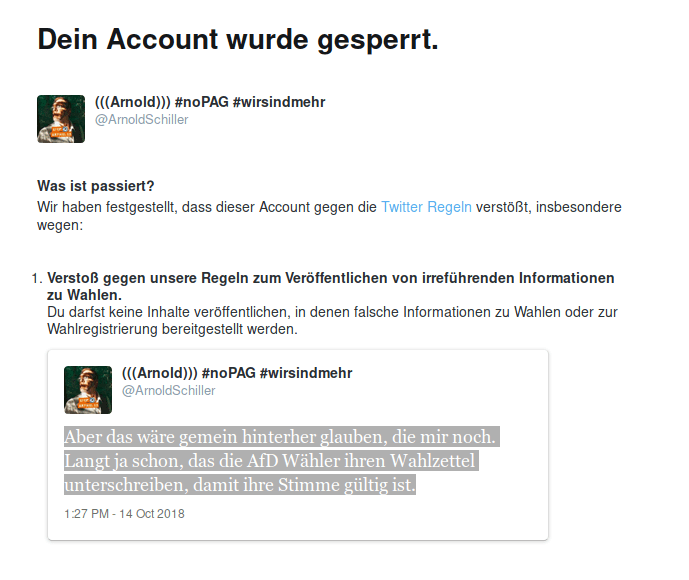 Per Mail erhielt ich eine Nachricht von einem Freund, dem das gleiche passiert ist. Twitter scheint Wahlkampf für die Nazis zu machen. Es handelt sich um einen Tweet von 2018, der hier als Grund verwendet wird um meine Meinung zu unterdrücken. Wir sind in der Diktatur angekommen und anscheinend ist jetzt alles zuspät. #NieMehrCDU #NieMehrCSU #NieMehrSPD #NiemalsAfD